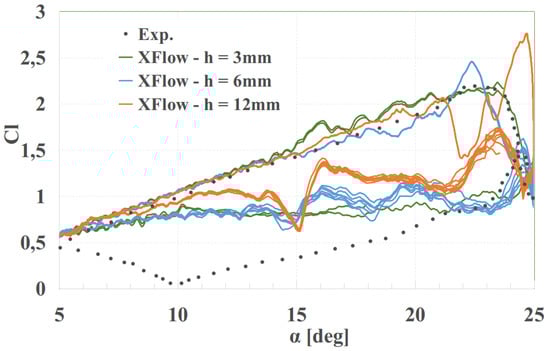 Regarding the lift and drag coefficients in Table 6, it can be seen that the errors between both resolution 5 and 10 mm are 1% for lift and 2% of drag. These convergence study is remarkable since at this angle of attack (with stalled flow), the flow is more complex to resolve. Looking for a trade-off between accuracy and computational cost, 10mm resolution (Medium mesh) was used for the rest of simulations.