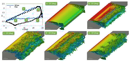 XFlow captures well the maximum lift. The hysteresis is relatively well captured although discrepancies are observed in the recovery region. The instantaneous vorticity iso-countours are depicted for various angles of attack, which correspond to different points in the lift hysteresis loop. Please note that in the linear region, the flow is mainly attached (see Figure 14a). In Figure 14b the flow detached and the convective vortex characteristic of rapid pitching (and dynamic stall) is near the end of the wing, which will soon produce an abrupt stall. The snapshots are consistent with the simulated and experimental curve. Figure 14c is characterized by massive detachment and deep stall, the suction side of the wing shows indeed massive detachment. The lift coefficient in Figure 14d,e disagrees between computations and experiments. In these regions XFlow predict a more rapid recovery (less detachment) that in the experiments.