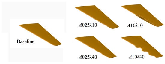 In this study, the tubercles were varied to study their effect over the aerodynamic coefficients. The parametric study was defined with the frequencies and , and the amplitudes and . These values were selected based on previous studies by Wei et al. [], who showed that for these values, the effect of the tubercles were more noticeable in this type of wing configuration. Table 5 shows the different set of parameter used to generate 9 different tubercles configurations. Additionally, the idea was to localize the tubercles only near the wing tip, since the baseline wing geometry was observed that stall initiates at the tip, in this study fixed to . Selected configurations are shown in Figure 16.