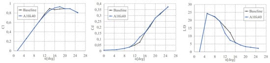 Having determined the most promising configuration for a high angle of attack ( deg), the rest angles of attack were simulated as depicted in Figure 17. The baseline geometry was compared to the optimal tubercles configuration geometry ( and ). More interestingly, note that the geometries with tubercles show an identical lineal regime for low angle of attack and a higher maximum lift with a more benign stall. However, when comparing the drag, we observe a mild increase at medium range of angles of attack that results in a decrease of the L/D. Overall, the efficiency, L/D, shows that the tubercles diminish the performance at medium range angles of attack, even if the lift coefficient improves near stall. These trends are remarkably similar to the experiments reported in Wei Wei et al. [] for a tapered swept-back wing, which was mentioned in the introduction of this section.
