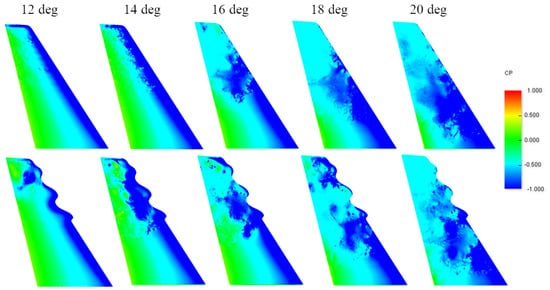 The results for lift, drag and efficiency at deg are compared in Table 7 for all configurations. The percentages, indicate the percentage variation of the modified geometry with respect to the baseline configuration. First, it can be seen that variations are relatively small in general. Second, we observe that the configurations and show a more important increase in the lift coefficient. The configuration shows an increase in the drag coefficient; however shows a decrease in the drag coefficient. This can be further quantified by comparing the lift over drag, L/D, where they have a and gain in with respect to the baseline configuration. It may be concluded that is the wavelength that provides the more benefit in terms of lift coefficient, and that amplitudes around show the most potential. In this work, the choice of the optimal configuration is based on CdCl and with maximum L/D [%]. Therefore, the optimal tubercles configuration geometry is ( and ).