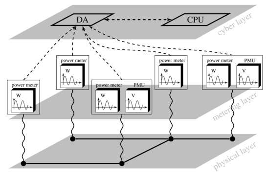 As aforementioned, the electric grid is evolving toward the smart grid concept due to the deep deployment of instrumentation devices and the use of ICT for monitoring and control. With this respect the power grid can be considered to be a cyber-physical system consisting of three layers which from top to bottom are given by (i) the cybernetic layer, (ii) the metering layer and (iii) the physical layer. See Figure 1 for a graphical representation of a smart grid as a cyber-physical system. The cybernetic layer consists of two main actors: the data aggregator (DA) and the central processing unit (CPU). The DA gathers the measurements coming from the metering layer and sends it to the CPU which performs all the computations.