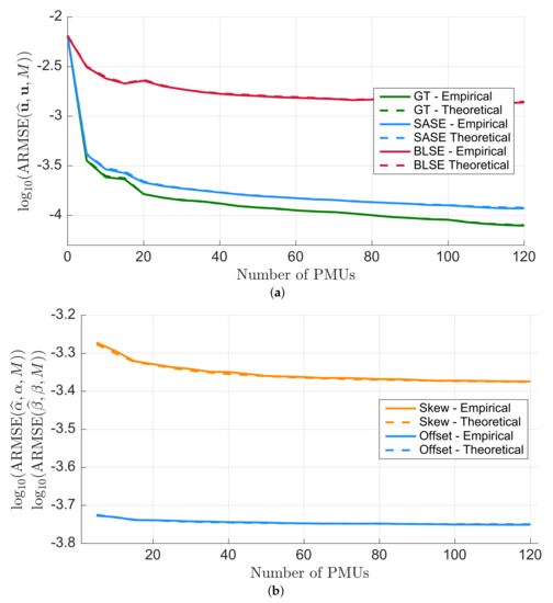 and we expect for large N. After Monte Carlo runs the behaviors of ARMSE (both empirical (17) and theoretical (18)) for the voltage phasor vectors () and the synchronization error parameters, as functions of the number of PMUs deployed in the grid, are shown in Figure 4a,b, respectively. For PMU deployment the greedy approach presented in [18] has been used. The PMU measurements have been processed with , right before a new synchronization instant occurs.