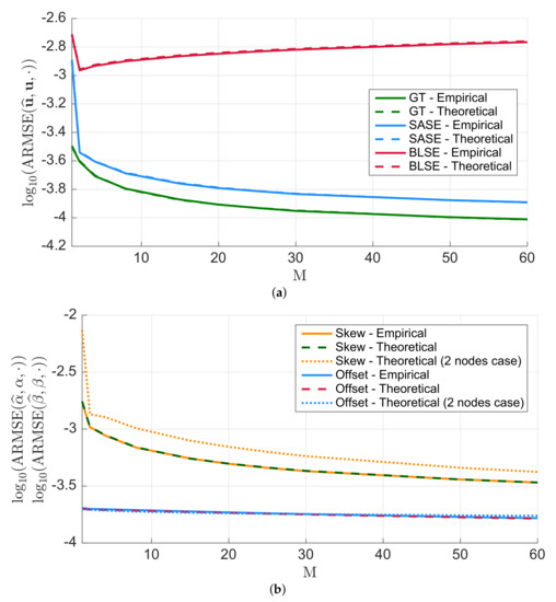 As stressed in Section 5, this is an intrinsic modeling problem due to the fact that offset and power demand happens to be linearly dependent. In addition, Figure 5b reports the values , in (16) as a function of M computed for the two-nodes network using the parameters value of Table 1. Observe how the theoretical values corresponding to the two-nodes case turn out to be extremely close to those obtained from the real network. This fact is interesting mainly for two reasons: (i) it supports the claim that in the limit for M (or T), the proposed estimator perfectly reconstructs the skews while residual error remains in the offsets; (ii) from the closed-form expressions for and , it is possible to retrieve, at least approximately, the value of the parameters needed to obtain a desired level of estimation accuracy.