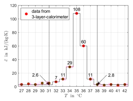 The data collected by 3-layer-calorimetry are given on a coarse grid with eight (in case of RT35HC) and seven (in case of RT44HC) values in the phase transition temperature range. The same grids are used for both numerical integration and spline interpolation. Consequently, both methods yield exactly the same values for the apparent specific heat capacity at the sampling points. From the differences between values for and the maximum differences between values for reported in Table 1, it can be seen that both methods yield almost identical results.