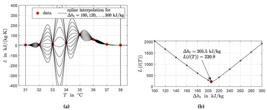 Piecewise spline interpolation for the data given in Figure 1. (a) Identified interpolating polynoms for different values of . (b) Minimization of the arc length of the interpolated apparent specific heat capacity (problem Equation (14)). Each value of marked by a black dot corresponds to one polynom in (a).