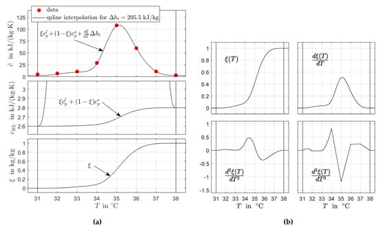 It can be concluded that the definition of in Equation (3b) is consistent with the model for the apparent specific heat capacity in Equation (2). Thus, the results of the numerical integration method (i.e., the discrete signals and ) are also consistent with the two-phase model in Equation (2).