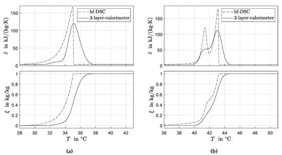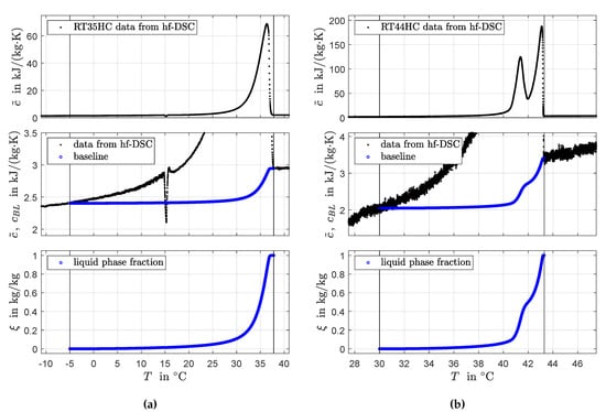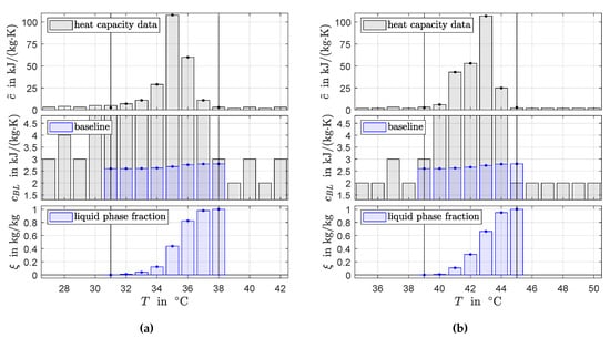 Following the two-phase apparent heat capacity modeling approach the data from the measurement procedures in Section 2.1 represent apparent specific heat capacities, as defined in Equation (2). Within the phase transition temperature range, the contributions from the solid and liquid heat capacities (in the following referred to as baseline) and the phase transition enthalpy are not determined individually.