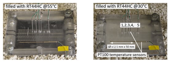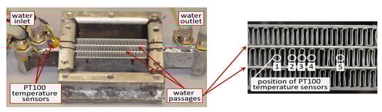 The PCM temperatures are measured by class A/0 C, 3-wire PT 100 Ohm temperature sensors (Heinz H. Meßwiderstände GmbH, Elgersburg, Germany). The measurement error is ±0.15 − 0.35 K. The sensors are installed in one air passage as shown in Figure 7 and Figure 8. The temperature at the liquid passage outer surface is measured by PT 100 temperature sensors of the same accuracy, see Figure 7 for their position.
