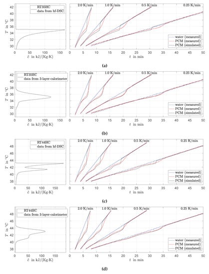 Both measured and predicted RT44HC temperatures are clearly affected by the two peaks in . The sharpness of the two peaks in derived from hf-DSC data leads to strongly pronounced responses (sudden changes in the course of predicted PCM temperatures). These effects are less present in the measured data. The phase transition model derived from 3-layer-calorimetry data fits the measured PCM temperatures better. The same is observed for the predicted and measured RT35HC temperatures. Table 2 reports the mean absolute and maximal differences between experimentally measured and predicted PCM temperatures. These values support all discussed results.