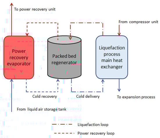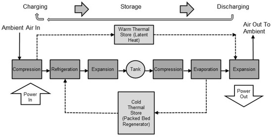 Energy storage devices are necessary to balance electrical grids that are increasingly powered by intermittent renewable resources [1,2]. Electricity generated during times of low demand or by intermittent sources can be stored and later used during periods of high demand [1]. Pumped hydro storage is considered one of the most attractive and robust solutions, but deployment is limited by the need for specific geological conditions [3]. Other technologies, such as batteries and compressed air energy storage, have been proposed and deployed on a limited scale. Cost, geographic constraints and environmental impacts have limited wider deployment. Compressed air storage has similar geographic constraints to pumped hydro, and is reliant on suitable geological features, such as salt caverns, to store the compressed air. Batteries provide an attractive solution for local grid reinforcement and frequency balancing, but are expensive for large scale energy and power management [4]. Liquid air energy storage (LAES) has received increasing attention as a potential large-scale storage concept to overcome the major geographical requirement characteristic of pumped hydro and compressed air energy storage, as well as the high cost of batteries [3,5]. Surplus electrical energy is exploited to liquify air that is used as a means of storing thermal energy in a tank. Electrical energy is later re-generated on demand by compressing the liquid air and using thermal energy available in the environment to heat the liquid and expand the warm, high-pressure air through a turbine [5,6]. To improve the process’ overall efficiency, Highview Power proposed a LAES layout with the addition of a packed bed regenerator (PBR) that is used to capture and store cold thermal energy that would otherwise be wasted during discharge (see Figure 1).