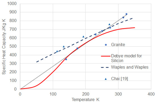 The temperature-dependent properties of a granite and sandstone sample are presented in Figure 4. Published data from Waples [29] and predictions by the Debye model [30] are included on the plot. Fundamentally, at absolute zero the heat capacity of a solid is considered to be zero.