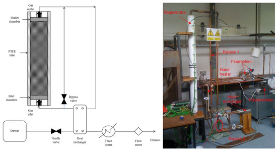 A lab-scale PBR was built using a Polytetrafluoroethylene PTFE tube with a 100 mm internal diameter and a 1440 mm long test section full of gravel. Headers of generous volume and a diffuser were included at each end of the regenerator to ensure even distribution of the flow field and minimise end effects. PTFE was selected as it is (a) compatible with cryogenic temperatures and (b) has a low thermal conductivity (unlike stainless steel or aluminium). The store was insulated using one layer of a high-grade cryogenic insulation of 25 mm thickness. During testing, some condensation was observed on the outside of the insulation but no freezing, indicating the effectiveness of the insulation.