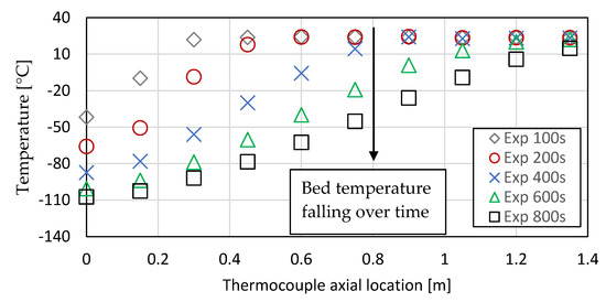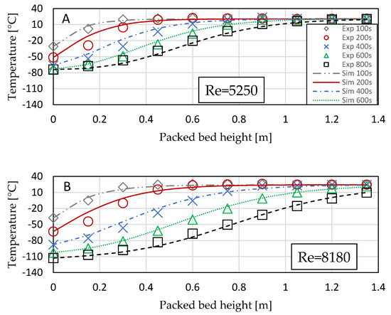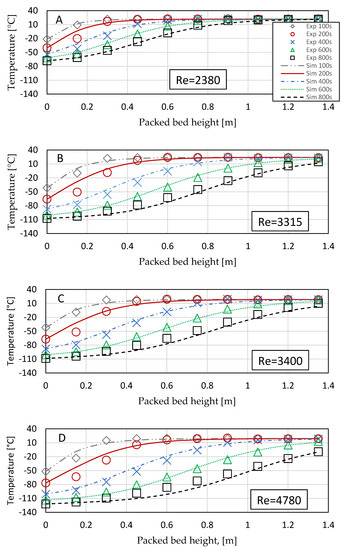 It should be noted the initial temperatures are lower at high Reynolds numbers as the first results taken were 100 s after the start of the test; thus, the start of the bed will be cooled more in the initial phase at higher flow rates. Data are not reported at time zero due to variations in stabilization of the flow at the start of the experiment.