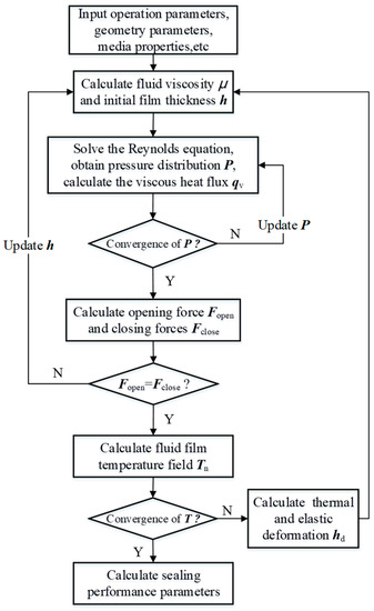 All the above control equations are solved using the finite difference method combined with multiple iterative numerical algorithms. The computational procedure is shown in Figure 3. This procedure includes three iterations. The first cycle is the iteration of the oil film pressure field at the end face, the second cycle is the force balance cycle, and the third cycle is the cycle of thermoelastic deformation at the end face. There are two ways to judge whether the iterative process converges: the absolute convergence criterion and the relative convergence criterion. The relative convergence criterion is chosen in this paper. As long as the load of two iterations meets the relative accuracy, the iteration is considered to converge, which is defined as follows: