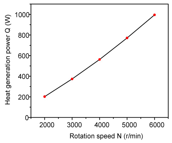 Figure 4 shows the change in heat generation power with the rotation speed. The heat generation power increased approximately linearly with increasing working rotation speed. Figure 5 shows the end face temperature distribution along the radius at different rotational speeds. As the rotating speed increased, the temperature increased gradually because the increase in rotating speed leads to increases in the viscous shear heat and contact friction heat in the seal gap. The temperature difference between the inner and outer diameters increased gradually due to the contact friction of the microprojections at the inner diameter and the strong convection heat exchange at the outer diameter.