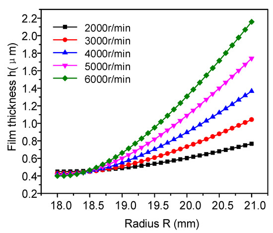 Figure 6 shows the change in film thickness in the radius direction at different rotational speeds. The gap between seal rings was convergent at different rotating speeds, and the convergence degree gradually increased with increasing rotating speed. The main reason for this trend is that the temperature difference between the inner and outer diameters gradually increased, which caused the thermal deformation at the inner diameter location to gradually increase and eventually caused the convergence degree of the seal gap to gradually increase. Therefore, there is a positive correlation between the change in the end face temperature and the change in the seal gap convergence degree at different rotating speeds: the higher the end face temperature is and the greater the end face temperature difference between the inner and outer diameters is, the stronger the seal gap convergence degree.