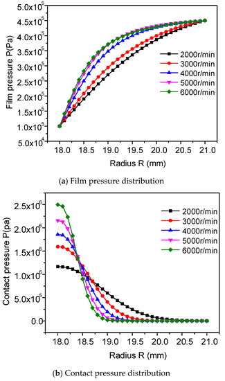 Film pressure and contact pressure distribution in the radius direction at different rotation speeds.