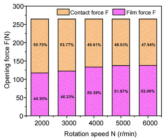 Figure 8 shows the variation in the composition of the opening force with the rotation speed. Notably, with increasing rotational speed, the proportion of the contact force to the opening force gradually decreased, and the proportion of the film force to the opening force increased. Specifically, the oil film thickness increased, and a convergent gap formed as the rotational speed increased.