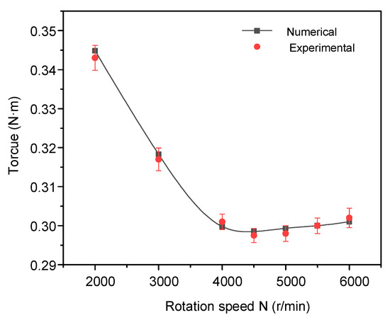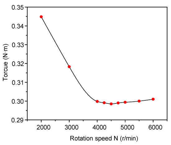 Figure 9 shows the variation in the friction torque with the operating speed. The friction torque first decreased rapidly and then increased slowly with the working speed. Notably, as the rotating speed increased, a lubricating oil film gradually formed at the seal end face, thus reducing the friction torque. When the rotating speed was further increased, the end face forms became convergent, and thermal deformation and force deformation occurred. The inner diameter of the seal ring was in contact with the face, so the friction torque increased. For the mechanical seal structure studied in this paper, the torque was minimum at 4500 rpm.