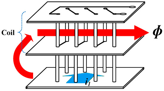 In the PCB model of the existing pick-up coil [30], the sensor coil is a vertical structure on the conductor trace where the current flows; moreover, the sensor coil is composed of trace lines and vias, and is configured to transfer the magnetic flux generated by the primary current inside the coil in Figure 2.