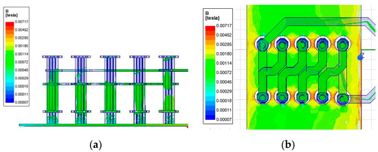 PCB circuit analysis using finite element method: (a) current flow of 5×100 A; (b) top view of magnetic flux density; (c) side view of magnetic flux density.