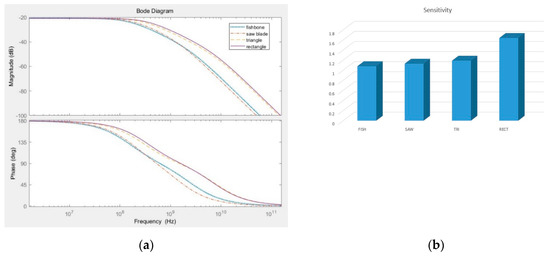 Current sensors used in GaN devices are required to simultaneously secure high sensitivity and bandwidth. Because the bandwidth (BW) of the coil is significantly influenced by the self-inductance value of the coil as seen (4), the coil must have a minimum self-inductance value Lc to ensure sufficient bandwidth. Further, the coil must have high sensor sensitivity because it is configured to allow maximum magnetic flux inside the core. From Figure 4a, it can be observed that the bandwidth for the same value of mutual inductance with the conductor are in the order of fishbone type > saw blade type > triangle type > rectangle type for each model. With the same self-inductance criterion, the sensitivity of the sensor appeared in reverse order in Figure 4b. Therefore, when designing a sensor coil based on a specific sensitivity, a rectangular coil model representing the widest bandwidth can be selected.