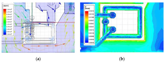 The proposed coil is in the form of two turns of the rectangular shape on a two-layer design; moreover, the trace through which the primary current flows wraps the sensor coil on three sides. The width of the coil trace is 0.4 mm, and the spacing between the coil and the trace through which the primary current on the three sides flows is 0.17 mm as shown in Figure 5a.