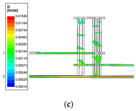 Figure 6a shows the direction of current and Figure 6b,c illustrate the distribution of the magnetic field between the sensor and the conductor when a 5 A conductor current flows in the proposed double-layer rectangle sensor model. In the figure, the arrow indicates the direction of the current, and the magnetic field diagram shows the magnetic flux density value according to the distance between the coil and the conductor on three sides.