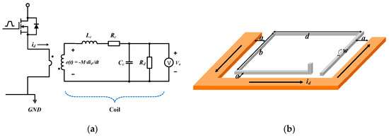 Figure 7b shows the geometry of the single coil based on the lump equivalent circuit of a ℼ model, as shown in Figure 7a, where a is the distance from the trace through which the primary current flows to the coil, and w is the width of the coil. Thus, when the magnetic field flux formed by the current passes through area S, the magnetic flux in the area is calculated as follows.