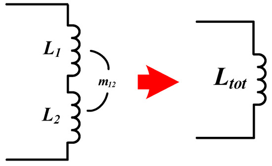 The proposed model is composed of two single coils in series, as shown in Figure 8. The coils of each layer have a self-inductance value of Ln, and each coil forms a mutual inductance with the other. Here, m12 represents the mutual inductance value between the first layer and the second layer. Moreover, the direction of the coil current of each layer is connected in series, as illustrated in Figure 5a; therefore, the inductance of the entire coil is a value obtained by adding the self-inductance and mutual inductance components in each layer. As a parameter for the dynamic performance analysis of the multi-coil, the total inductance is calculated using Equation (12).