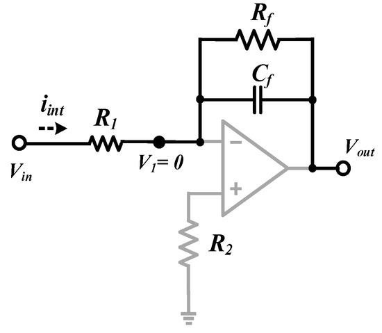 In the case of an integrator design, an active inverting integrator is applied [32,33,34,35], and a integrator resistor Rf and integrator capacitor Cf are added to the operational amplifier (OP-Amp) to limit the integrator infinite gain value to a finite gain value when a current of low frequency and the DC component flows in the integrator in Figure 9.