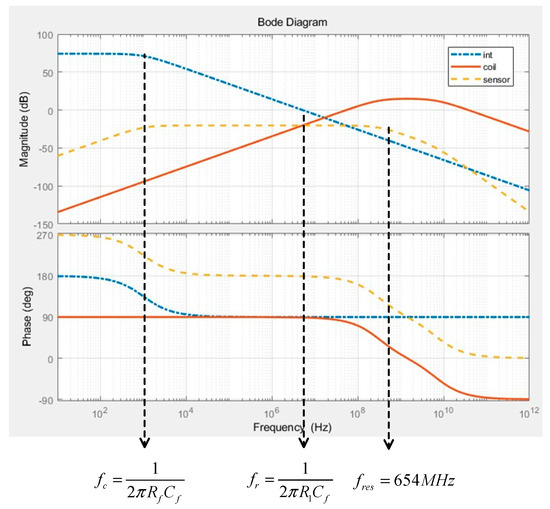 Accordingly, the sensor bandwidth for ensuring accurate measurement results must be secured to a value that is at least two to three times the value of the bandwidth of the power semiconductor [31]. Therefore, when the integrator cutoff frequency is set to 1 kHz, it is possible to guarantee a sensor bandwidth of over 440 MHz. Further, the transfer function of the current sensor with the integrated sensor coil and integrator is obtained as follows.