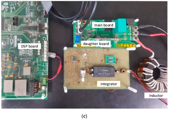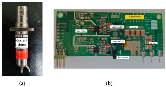 Figure 11a,b shows the shunt resistor sensor and the daughter board prototype of the double pulse test circuit. In the case of the switch current, the integrator output of the pick-up coil was compared with the results of the shunt resistor, and the load current was measured using a current sensor (LeCroy) with a maximum current of 310 A and 0.1 V/A output gain ratio. The prototype has two switches and a double-layer pick-up coil to measure the lower switch current in the half-bridge structure. The main and daughter boards are connected vertically through a connector head; Figure 11c shows the overall double pulse test set including an active integrator, digital signal processor board, inductor, main board, and daughter board. Table 2 lists the parameter values of the proposed coil and integrator.