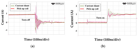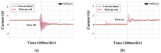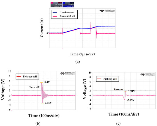 Figure 12 shows the output waveform of the current shunt and pick-up coil before and after the switching operation. In Figure 12b, during the switch-off operation, the positive peak output value is +5.4 V. Conversely, during the switch-on operation, the positive peak output value is +1.94 V.