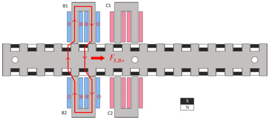 FX,B+) in the right direction (positive). Without PMs in the mover, the structure is a conventional LSRM, in which feeding the same phase B+ the propulsion force is zero at