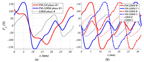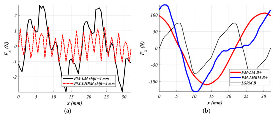 Figure 9b shows the propulsion force comparison results of the PM-LM and PM-LHRM structures, and also the LSRM. As can be seen, the force distributions obtained after shifting are significantly different in both PM motors. The peak forces are 130.4 N for PM-LHRM and 105.7 N for PM-LM, and the average forces are 60 N and 69 N, respectively. From the simulation results presented in