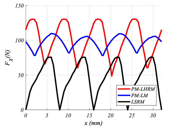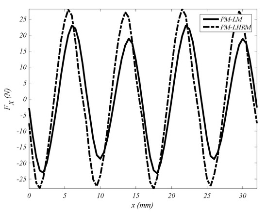 Figure 9a,b, PM-LHRM exhibits a lower detent force and a higher force peak in comparison with PM-LM. The LSRM shows the lowest propulsion force peak at 75 N.