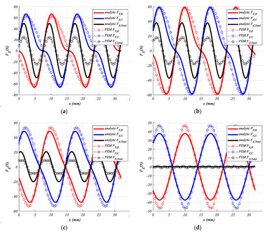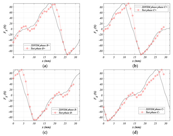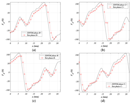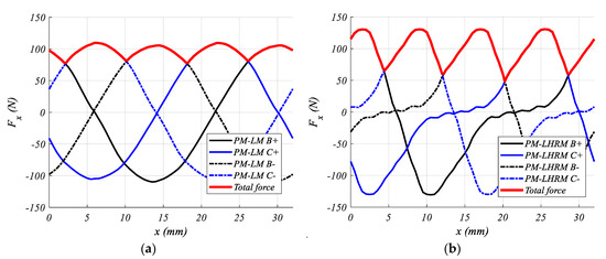 Figure 10a,b compare their propulsion force profiles, obtained by feeding the phases with a flat current waveform in switched reluctance mode, that is without overlapping phase currents. The phases are fed for obtaining a positive trust in the sequence B+ C- B- C+. The total trust obtained is the enveloping of the force profiles in the red line.
