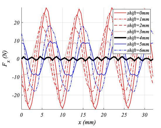 x = 0 mm, is the period of detent force (τ), which for this actuator is τ = 8 mm. The results corroborate the analytical results obtained from (9), and the minimum detent force is obtained for a shift of