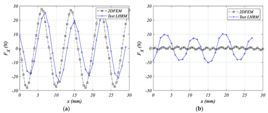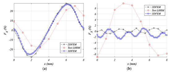 Figure 9a shows the detent force comparison of the two structures, in which the PM-LHRM present a significant lower detent force, meanwhile PM-LM has a wide cycle of the force of 16 mm, with peaks points over 2.5 N and −3 N.
