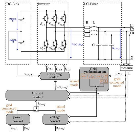 The ability of a BESS to black-start and maintain a Microgrid relies on an appropriate control design of its converter, which has already been named grid-forming converter above. As many BESS not only operate in island mode but also in grid-connected mode, the control design of theirs converter has to be able to switch between these two operation modes. Based on a simplified converter model, Figure 2 shows an appropriate control design which is capable of operating in both “island mode” and “grid-connected mode”.