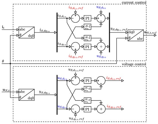 Based on the grid angle , the measured voltage- and current vectors and are used to calculate corresponding space vectors and via Park-transformation. In the voltage control, the voltage space vector is used to control the corresponding d- and q-components via PI-control based on a reference space vector . The coupling between the d- and q-components due to the LC-filter is taken into account by corresponding decoupling terms , where c is the normalized capacitance of the LC-filter, which is defined by , with as the nominal apparent power and as the nominal voltage of the converter. The resulting current reference space vector of the voltage control is used as input of the current control, which uses the current space vector to control the corresponding d- and q-components via PI-control based on this current reference space vector. The coupling between the d- and q-components due to the LC-filter is taken into account by corresponding decoupling terms , where l is the normalized inductance of the LC-filter, which is defined by .