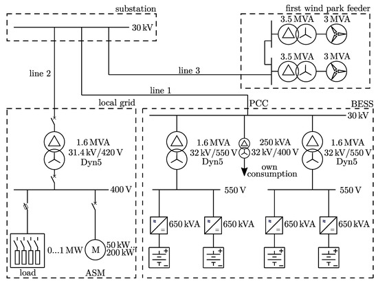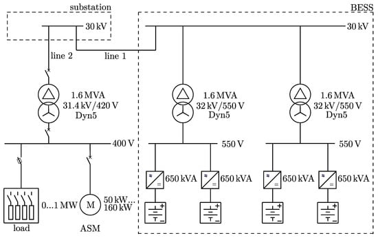 Figure 4 shows the single line diagram of the Microgrid which is investigated in the simulation. This Microgrid is based on a real Microgrid which was also investigated in [25]. In an extended version of this Microgrid, field tests were also performed, which are presented in Section 3. It consists of a BESS based on Li-Ion technology with a rated power of VA, which is connected via line 1 to a 30 -substation. Via line 2 and a transformer, an active load and an asynchronous machine are connected to the substation.