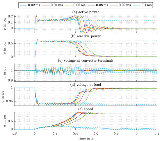 The parameters of the asynchronous machine are defined by a preset-model available in Matlab/Simulink. Figure 7a shows the active power, Figure 7b the reactive power, Figure 7c the voltage at the PCC of the BESS, Figure 7d the voltage at the 400 -bus of the asynchronous machine, and Figure 7e shows the speed of the asynchronous machine. The different curves show the results for different values of the converter control time constant . With the increasing value of , the voltage at the PCC of the converter starts to oscillate, resulting in oscillations of the active- and reactive power. With values higher than , the asynchronous machine can no longer be started. The corresponding results for an unstable motor start-up with are also shown in Figure 7. Figure 7e shows that the motor is not able to reach nominal speed any more. Therefore, the active- and reactive power demands remain at rather high values. This results in an ongoing voltage drop at the 400 -bus of the motor. A converter controller time constant of poses the stability limit for the start-up of a asynchronous machine with an apparent power of 160 in the Microgrid. Only with lower values of is a motor start-up possible. Such stability limits can be determined for different motor sizes. Table 2 summarizes these stability limits.