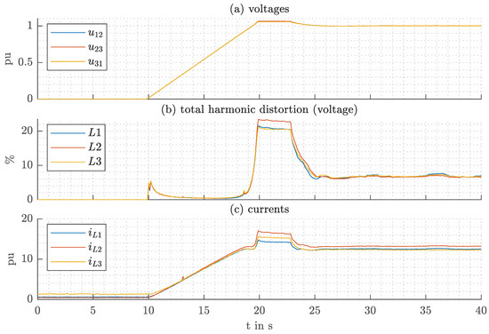 Measurement of voltages and current during a gradual increase of the voltage of the BESS in the Microgrid shown in Figure 8 while all transformers are connected. The small peak in can be considered as measurement error. Between 20 – 25 , the voltage exceeds a value of 1 pu due to a high level of harmonics, indicated by the total harmonic distortion in (b), which leads to higher root-mean-square values of the voltages.