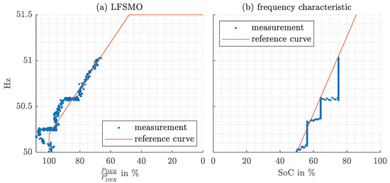 The simplest approach for such control mechanisms is using load-shedding for a surplus of load and power reduction for a surplus of infeed, in case either of them exceeds the power limits of the grid-forming unit. The frequency in the Microgrid can be used as control signal for both operations without the need for additional communication. For load-shedding, additional breakers that trip at certain frequency limits and a stepwise load-shedding plan with prioritization of loads may be necessary. For power reduction of generation units, the “limited frequency sensitive mode” (LFSMO) can be used. According to latest grid codes [19], generation units have to reduce their power output in case of a frequency that exceeds a limit of . This mechanism can be used in an islanded Microgrid to actively influence the power output of DER through the LFSMO. This kind of frequency control approach can not only be used to limit power flows beyond the limits of the BESS, but can also be used to perform an energy management to manage the state of charge (SoC). Such a frequency control approach is already being used in home storage systems [20]. A corresponding frequency characteristic to be used in a Microgrid described above is shown in Figure 1.