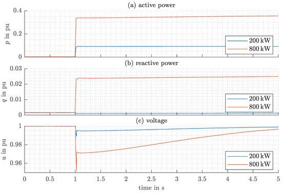 Based on the assumption that a voltage drop to pu is considered as the minimum dynamic voltage drop according to Bagert et al. [26], a maximum load-step of 800 is selected to be used in the field test, taking into account that the control parameters of the real converter are parametrized faster than a corresponding .