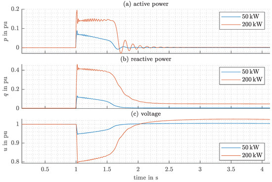 As already mentioned in Section 1.3, an important property of a Microgrid is its robustness against load changes. Such load changes can be divided into active- and reactive load changes. In the simulations as well as in the field tests, the significant active- and reactive load changes of a residential grid section are reproduced by a load-bank and motor start-ups. During the island operation of a Microgrid, its robustness against such load changes may be crucial to guarantee a stable grid operation with sufficient power quality. According to Bagert et al. [26], a value of pu can be assumed as reasonable value for a minimum dynamic voltage drop in a Microgrid. The converter model described in Section 2.1, therefore, is used to simulate the voltage drop during load-steps and the start-up of motors in order to identify the minimum dynamic voltage drop that can be expected during the field tests. Based on these simulations, the choice of the size of the loads and the motors for the field tests is made. As these voltage drops are depending on the control parameters of the converter, their influence is investigated in order to provide corresponding information for the field tests. This also applies to the motors, the successful start-up of which also depends on the control parameters.