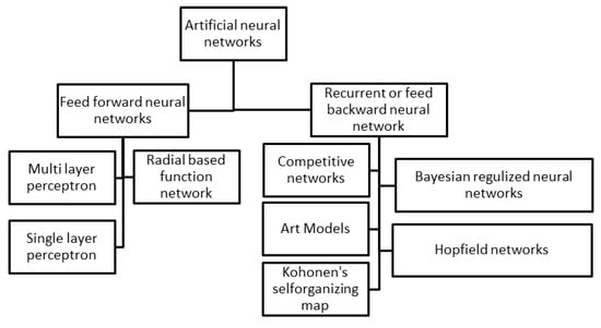 Typically, ANN is classified into two main groups; feed forward and feed backward [58]. Figure 2 shows a classification of the ANN model in detail. In our paper, the implemented NARX artificial neural network belongs to the recurrent or feed backward neural networks category. We also used the Bayesian regularization algorithm as the training algorithm. In the literature, many studies have used ANN methodology to model energy consumption in different sectors. They have compared their ANN methodology with other conventional models such as MLR and MARS. In the following, we perform a brief review and conduct a comparison between ANN and other conventional methods.